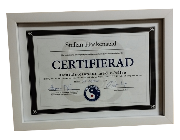 Jag är diplomerad och certifierad samtals terapeut, utbildad via e-universitetet. Jag har även jobbat inom socialpsykiatrin i några år och i grunden finns en MI-utbildning motiverande samtal kbt-inriktning.